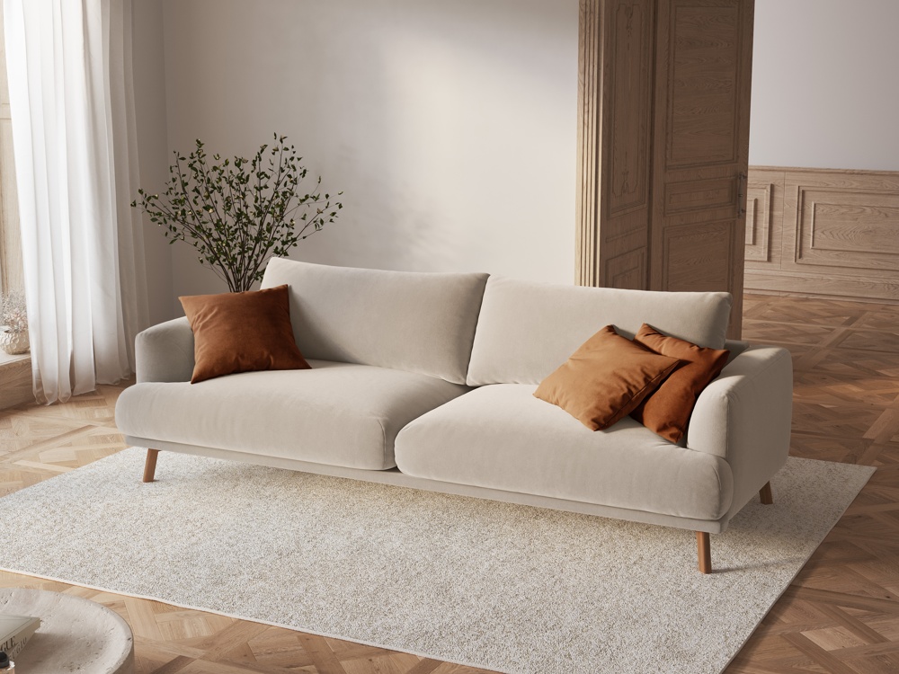 Ein schöner, luxuriöser Stoff mit leichtem Glanz und kurzen Fasern. Das Material ist dick und gehört zur Veloursgruppe. Er fühlt sich sehr schön und angenehm an und ist enorm abriebfest (Martindale Test 100 000 und 440 g / m2). Die auf dem Stoff verwendete Flüssigkeits-Stop-Technik verhindert, dass er Flüssigkeiten aufnimmt. Sie bewirkt, dass sich die Flüssigkeit auf der Oberfläche des Materials ansammelt, ohne tief in die Fasern einzudringen. Dank dessen werden Kaffee, Tee oder Wein, die auf den Stoff gegossen wurden, in wenigen Sekunden durch Auflegen eines saugfähigen Tuchs oder eines Papiertuchs entfernt. Der Stoff hat den Zigarettentest bestanden, was bedeutet, dass das Polstersystem glimm- und flammenbeständig ist und die Norm PN-EN 1021-1: 2014-12 erfüllt.